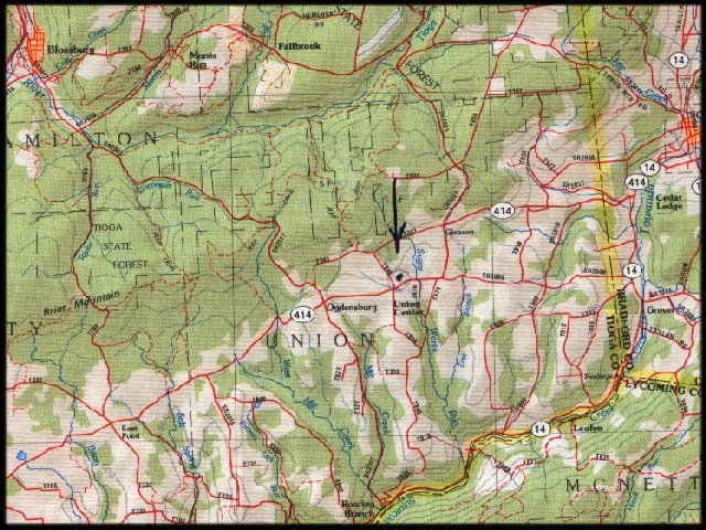 A map of the area. Blossburg is at the upper left and Canton is on the upper right. The cemetary is the dot near the center, and an arrow points to it.