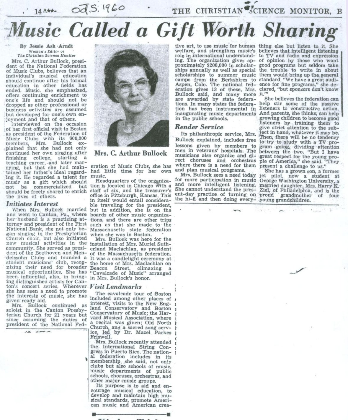 During World War II, she taught at Canton High School, was the co-chairman of Civil Defense, and county chairman of War Savings. Active in the Pennsylvania Federation of Music Clubs, she served in many capacities including president and parliamentarian. She served as president of the National Federation of Music Clubs (NFMC) from 1959 to 1963. Aware of the therapeutic value of music, she helped set up the Conservatory for the Blind. Two Dorothy Dann Bullock Music Therapy scholarships given annually in her name recognize her dedication to music therapy. Two additional national monetary awards are given in her honor each year, one in piano and one in piano composition. For years, she and her husband went to Chautauqua summers and became interested in its development and cultural benefits. While she was president of the NFMC, the Music Building at Chautauqua Institute was erected by the Northeastern Region of the NFMC and dedicated in her honor. Several years later, in 1968, she was chosen by the trustees of Chautauqua to be president of the Chautauqua Women's Club. This position involved public relations, planning afternoon programs and hosting visiting artists at the spacious club house. She had many achievements and awards. In 1963, she was appointed by President Kennedy as a member of the Advisory Committee on the Arts for the Kennedy Center (National Cultural Center), President Nixon's nomination, with consent of the Senate, designated her as a representative on the United States Delegation to the 1972 United Nations Education, Scientific and Cultural Organization (UNESCO) Conference, which she attended in Paris, France. She received honorary doctorates from three universities. She is listed in "Who's Who in America." "Who's Who in Music - International," "Who's Who in American Women" and Dictionary of International Biography. She was a member of the honorary musical society Sigma Alpha Iota. Among her many awards and honors are "Honorary vice-governor of the State of Oklahoma," "Kentucky Colonel" and honorary "Coonoluftee Indian Villager" as the "Maker of Songs." She is survived by her son Charles Bullock, and her daughter and son-in-law, Donna and Dr. Harry Ziel, all of Glendale, Calif. She is also survived by 10 grandchildren and their spouses; 12 great-grandchildren; one sister-in-law; and numerous cousins, nephews and nieces. Services will be conducted at the Canton Ecumenical Parish, 53 N. Center St., Canton, at 2 p.m. Saturday, April 10, with Pastor Nancy Lee Goff officiating. Calling hours will be from noon to 2 p.m. at the church. Interment will follow in the Main Street Cemetery in Canton. Arrangements have been entrusted to the Morse and Kleese Funeral Home of Canton. -Canton Independent Sentinel.